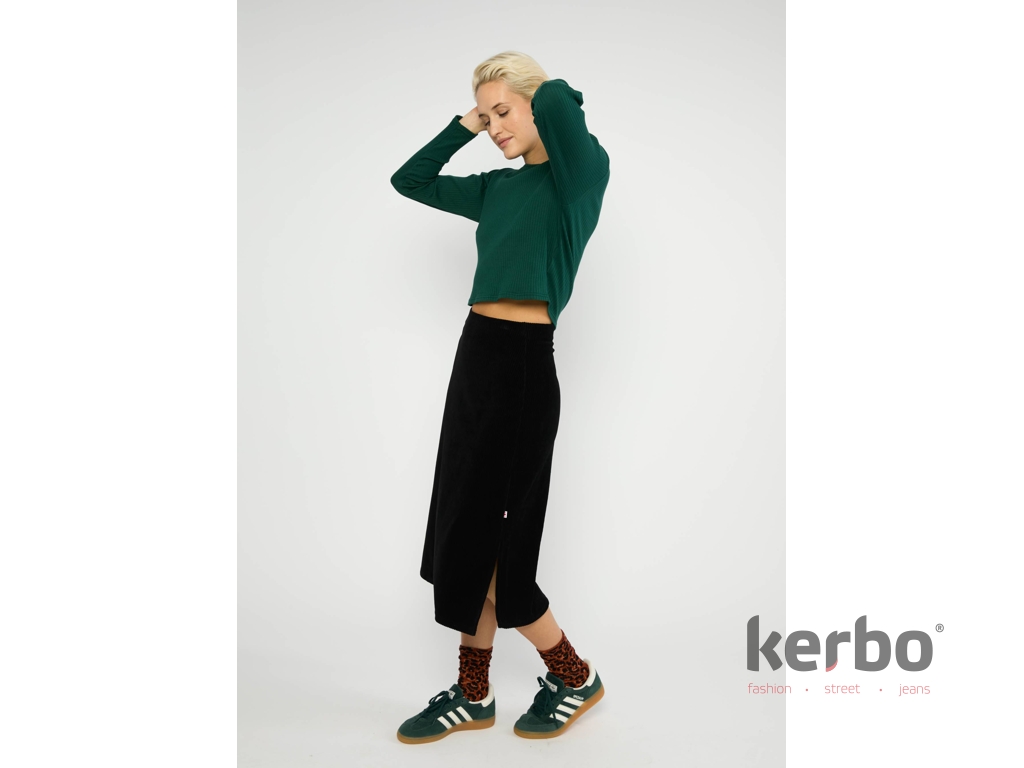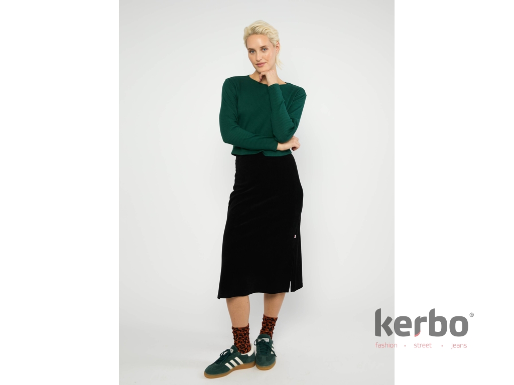 Univerzální dámská sukně od značky Blutsgeschwister. Tato sukně v elegantní černé barvě působí nadčasově a velmi žensky, přičemž jemná manžestrová struktura dodává outfitu hloubku a charakter. Přiléhavý střih s délkou do poloviny lýtek krásně prodlužuje siluetu a boční rozparek zajišťuje pohodlí i přirozený pohyb. Je to sofistikovaný kousek, který snadno zkombinujete s úpletem, halenkou i kozačkami a vytvoříte stylový look pro chladnější dny.