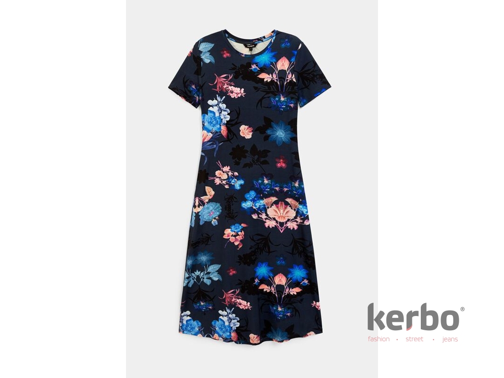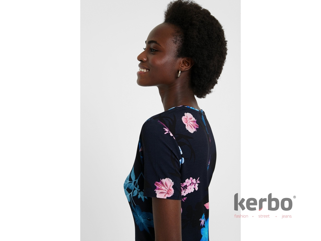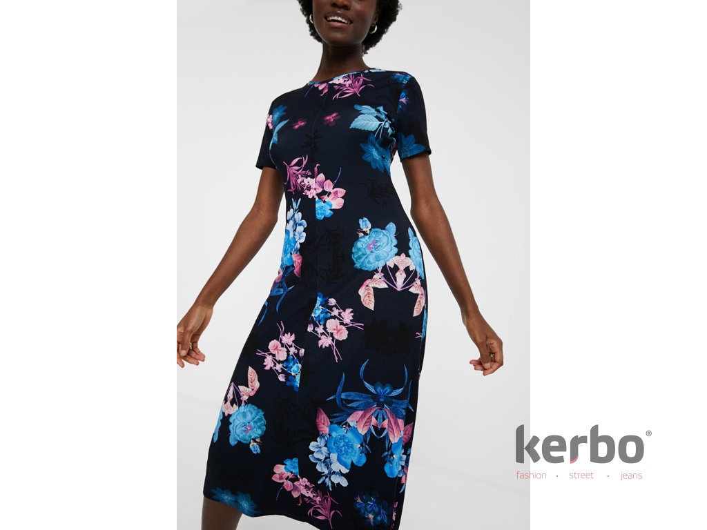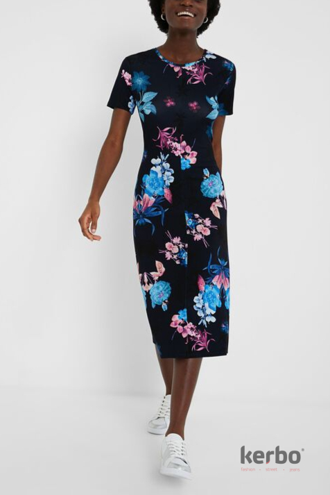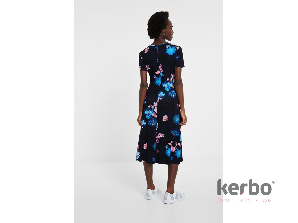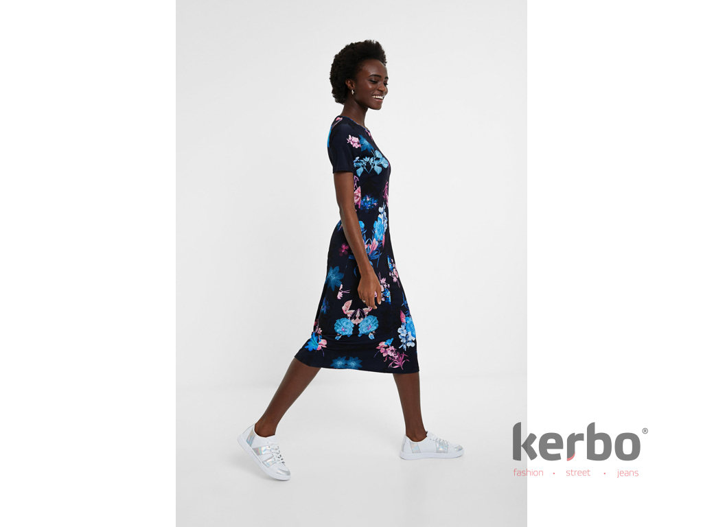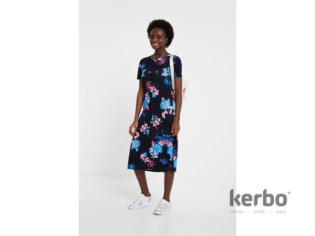 Tmavě modré dámské šaty Bouquet s květinovým motivem od značky Desigual. Pohodlný a pružný materiál Vám zaručuje maximální pohodlí po celý Váš den. Šatičky využijete do kanceláře, města i na výlet s rodinou.