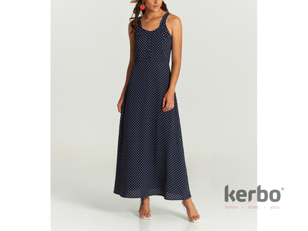 Tmavě modré dámské MAXI šaty s puntíky od značky Mismash. Šaty využijete do kanceláře, města i na společenské události. Vypasovaná horní část a splývavý střih sukně Vám vykouzlí krásnou siluetu.